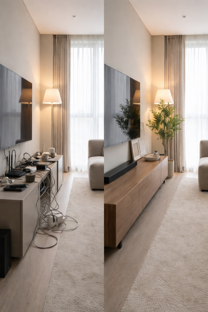 Visible wires can make even a beautiful room feel messy. Hide TV cords, charger cables, and router wires using simple fixes like cable boxes, clips, or smart furniture placement. Clean, uncluttered lines instantly create a modern, luxury feel. Designers know this secret: less visual clutter always makes a home look more polished.
