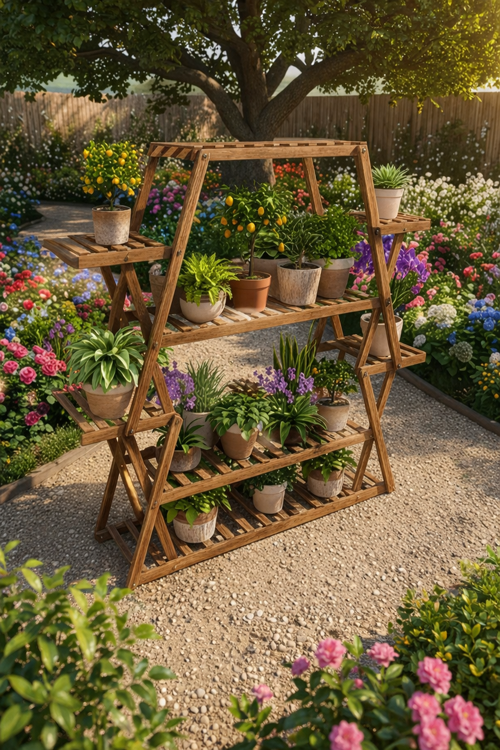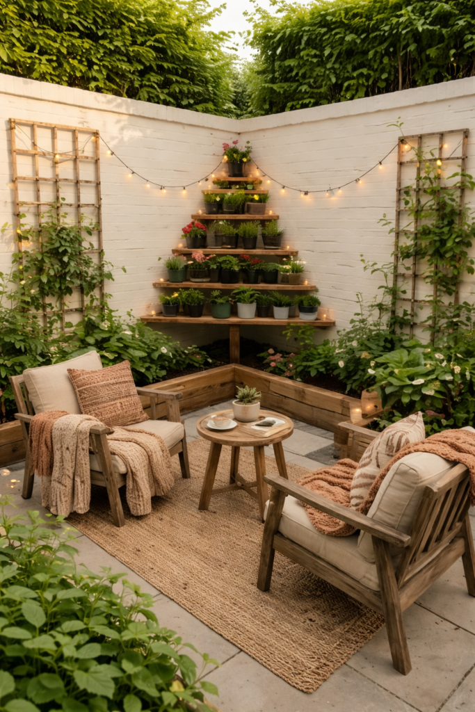 Tiered plant stands are a wonderful way to bring more life into a small garden without feeling crowded. By stacking plants at different heights, they create a layered, lively look that instantly makes the space feel fuller and more inviting. Even a tiny corner can feel organized and charming, while still giving each plant room to shine. It’s an easy, stylish way to make the garden feel thoughtful, cozy, and full of natural beauty.