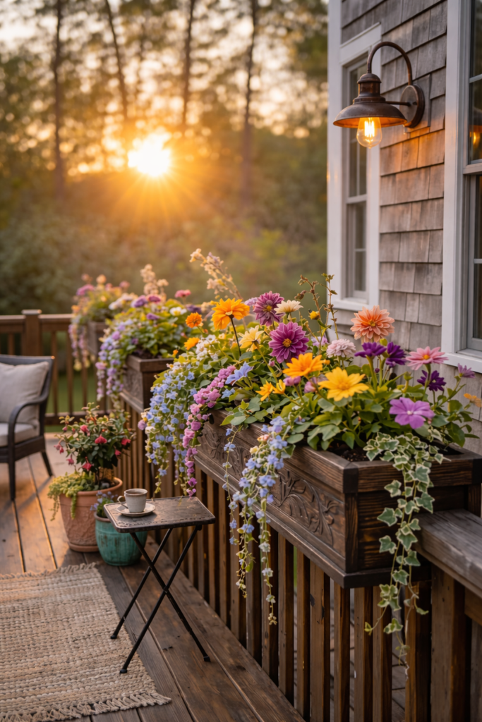 Decorating railings with planters is a simple way to make a small garden or balcony feel lively and welcoming. By hanging planters along the railings, the space stays open while still bursting with greenery and color. Flowers or trailing plants spilling over the edges add a soft, natural charm. Even in a tiny garden, this little touch can make the area feel brighter, cozier, and full of life; turning it into a space you’ll love spending time in.