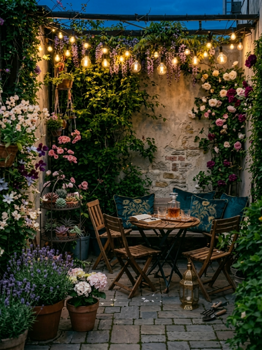A small garden can feel magical with just a few thoughtful touches. Cozy seating, a bistro table, or a soft rug instantly make it inviting, while hanging planters, tiered stands, and painted pots add personality. Little details like wooden crates or railing planters bring charm and life, turning even a tiny space into a peaceful spring retreat.