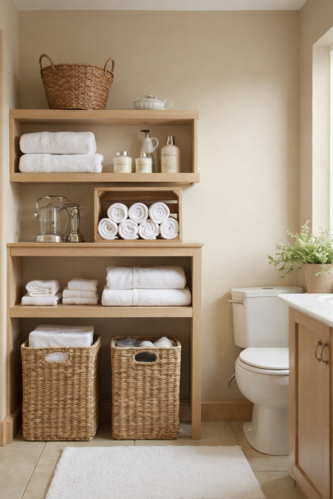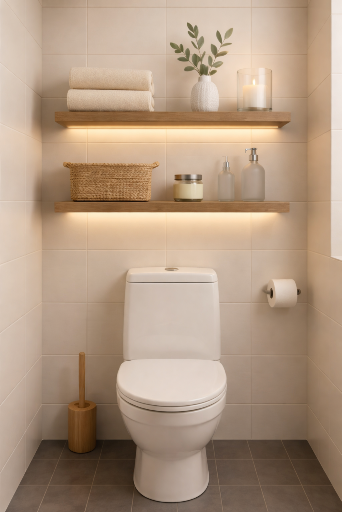 Don’t let the space above your toilet go to waste. Adding an over-the-toilet shelf, a slim ladder shelf, or a small wall cabinet can give you extra storage without using floor space. It’s a simple way to keep essentials organized and make a small bathroom look neat, functional, and thoughtfully designed.