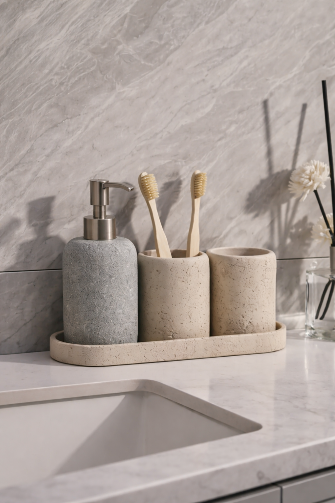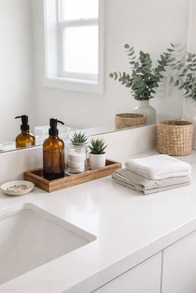 Sometimes the best bathroom upgrade costs nothing at all. Clearing your countertop can instantly make the space look cleaner and more modern. Keep only essentials like a soap dispenser, a small plant, a simple tray, and a toothbrush holder. Less clutter helps your bathroom feel calm, organized, and visually more expensive.
