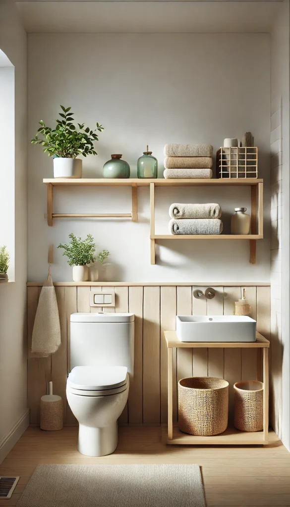 In a small bathroom, using wall space is a smart way to add storage without making the room feel crowded. Floating shelves help keep things organized while adding style. Use them to display towels, small plants, candles, or storage baskets to make your bathroom feel neat, modern, and more inviting.
